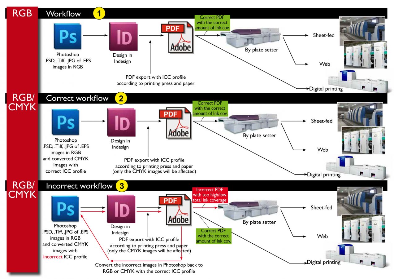 Avant de créer le PDF, il est important que les images et les photos soumises aient un bon profil de couleur. On distingue 3 flux de travail.